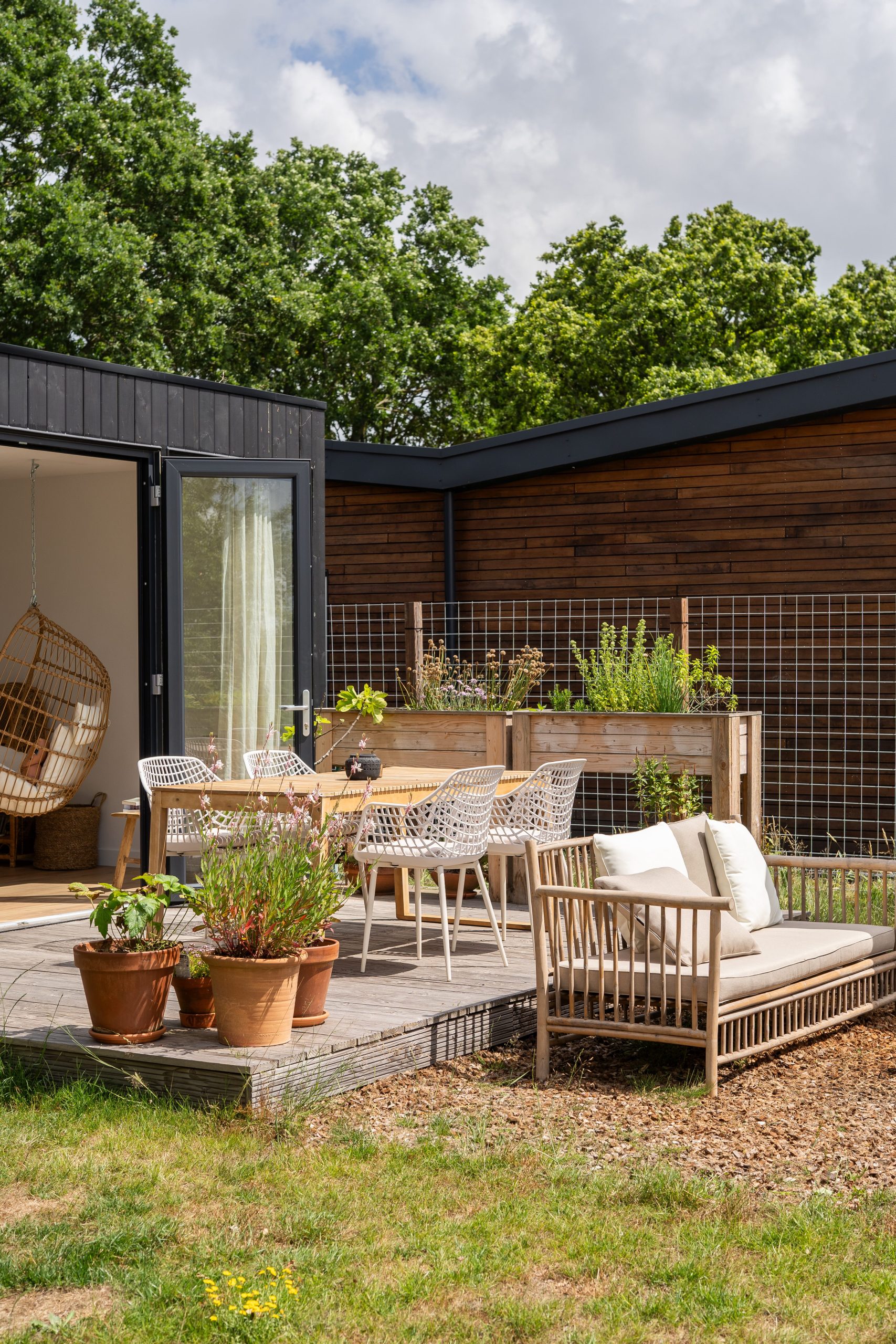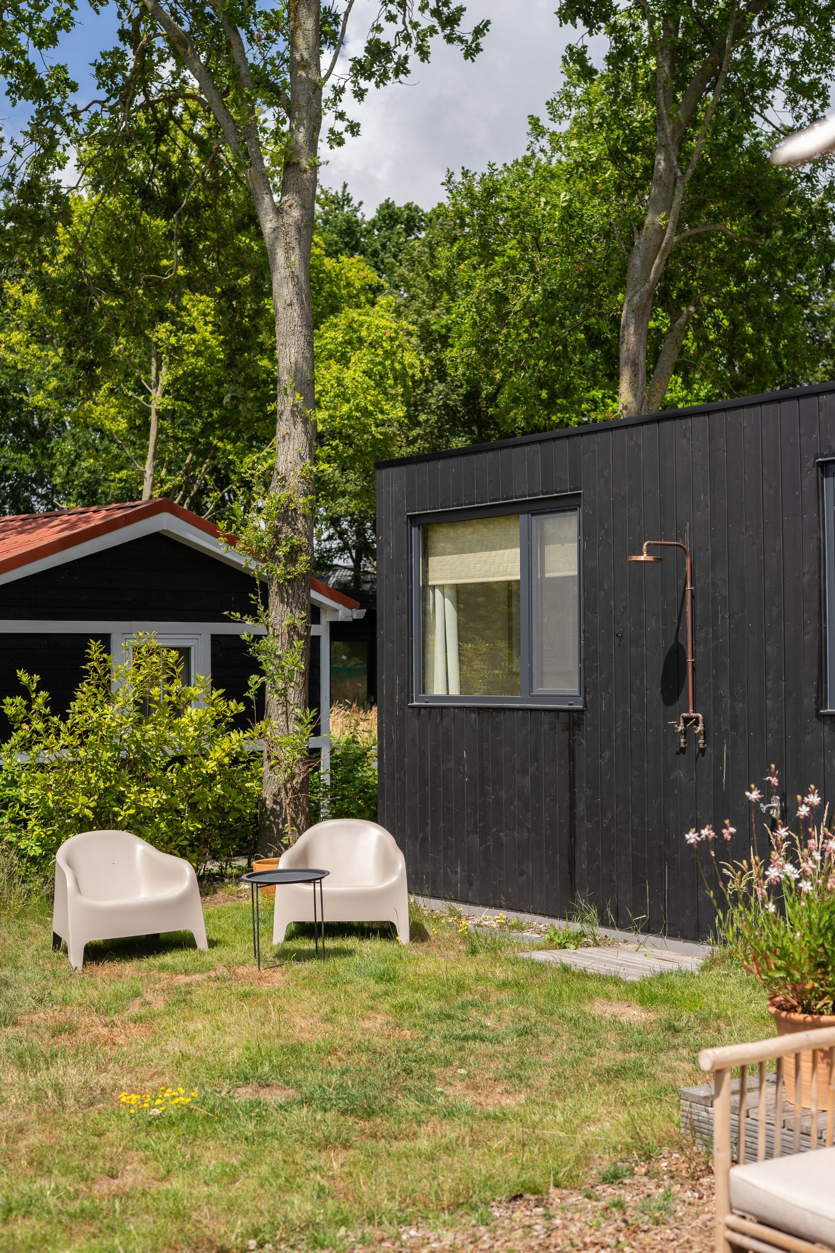 Vanuit de openslaande deuren loop je zo het houten terras op en de tuin in. Er staat een buitentafel met 4 stoelen, een bamboe tuinbank met fijne kussens en 2 relax stoelen. Er is een buitendouche met warm en koud water: heerlijk om in de ochtend onder wakker te worden of om af te koelen op een warme zomerdag. Aan het einde van de tuin ligt één van de oudste dijkjes van Nederland, waar in de lente en de zomer de schaapjes regelmatig voorbij lopen. Hier geniet je van de rust met vrij uitzicht over de polder.